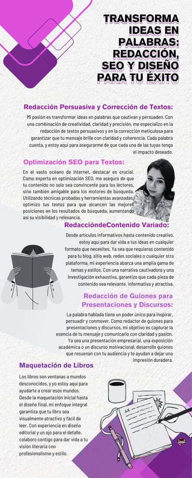 ¡Hola! Mi nombre es Daniela. Soy una apasionada de la lectura y la redacción, cuento con más de 3 años de experiencia en redacción de textos. En mi trayectoria como redactora, he tenido la oportunidad de abordar una amplia gama de temas, desde artículos académicos hasta contenido creativo, pasando por guiones educativos y materiales didácticos, he participado en guiones para obras de teatro, preparación de discursos académicos, ponencias, defensas de trabajos de grado nivel profesional.